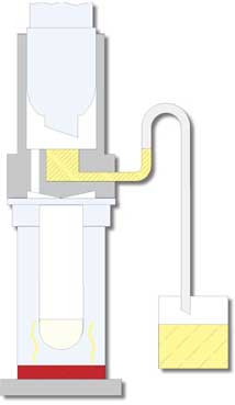 Стадія 2. Рівень розчинника знижується нижче екстракційної вставки. Надлишок розчинника збирається в каністрі для відновлення розчинника позаду приладу. | ![]() |