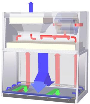 Ближче до робочої поверхні повітряний потік розділяється на передній і задній потоки. Фронтальний потік проходить через фронтальну решітку повітрезабору і далі під робочою поверхнею, задній потік йде з області робочої зони через решітку повітрезабору задньої стінки боксу. Частина низхідного повітряного потоку проходить на високій швидкості через решітки повітрезабору з боків робочої поверхні.